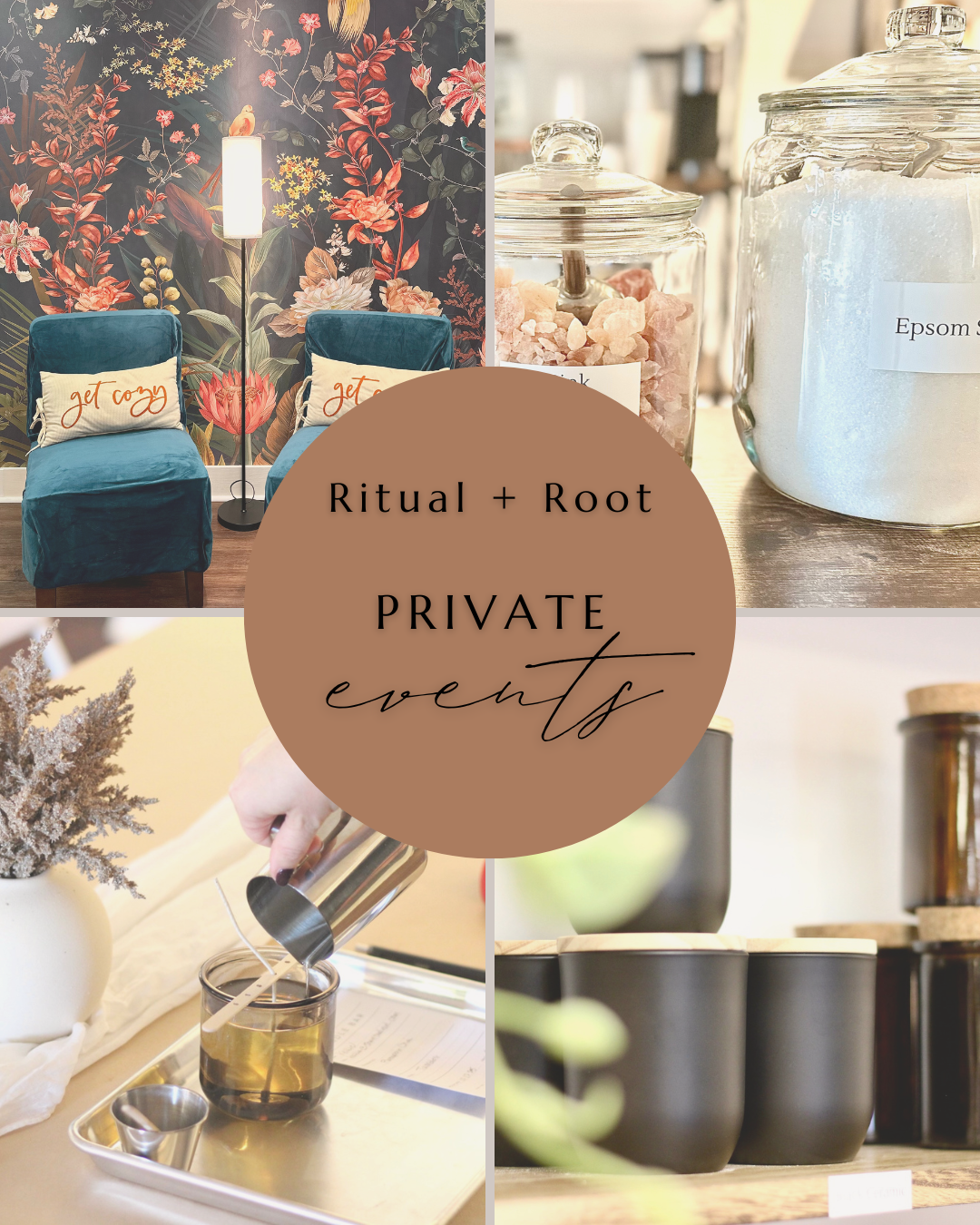 Create space for connection, creativity, and intention with a private event at Ritual + Root. Whether you’re hosting a workshop, team retreat, or intimate gathering, we’ll help you design an experience that feels personal and inspired. Choose from our curated packages or customize your event to make it truly your own.